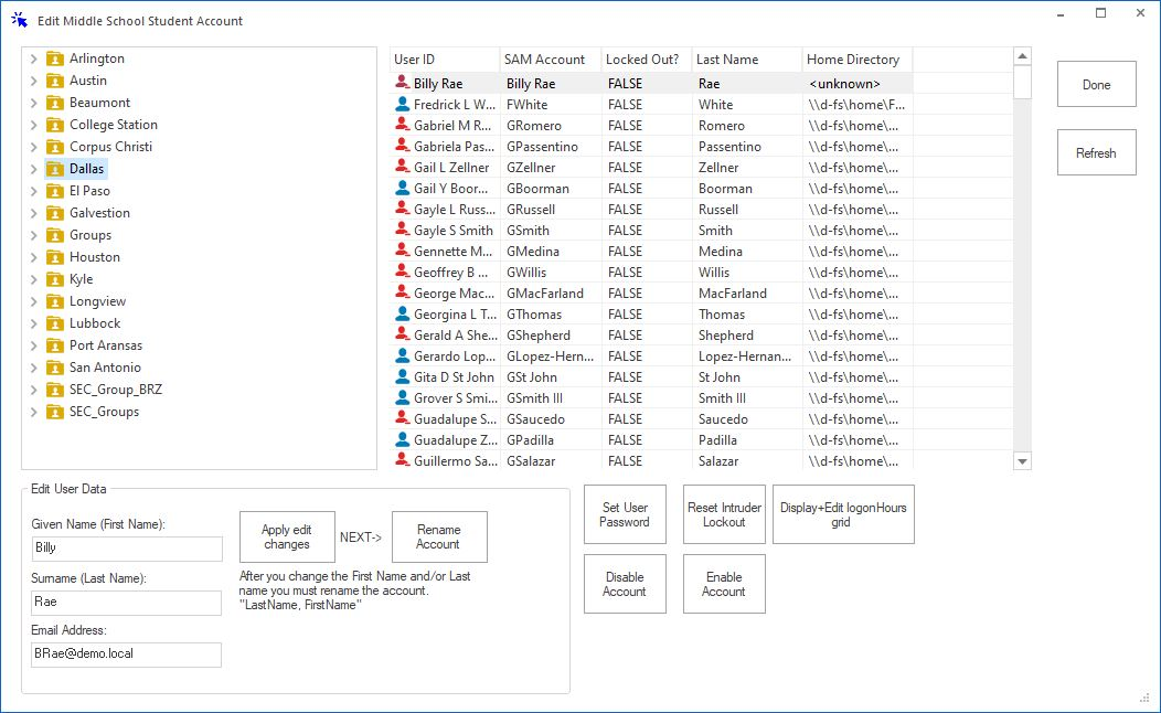 - If a user is in Active Directory in specific OU and not in the CSV file, the user is disabled and moved to another OU and the home directory is moved to a new location.